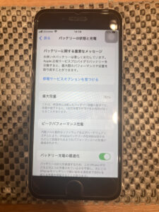 お客様にお持ち込みいただいたiPhoneSE2はバッテリーが劣化し、最大容量が76%のサービス表記が出ている状態でした。