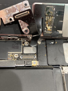 無事、問題なく開けることが出来ましたが、ネジが何本か止まっておらず、画面のコネクタも切れていることがわかります。